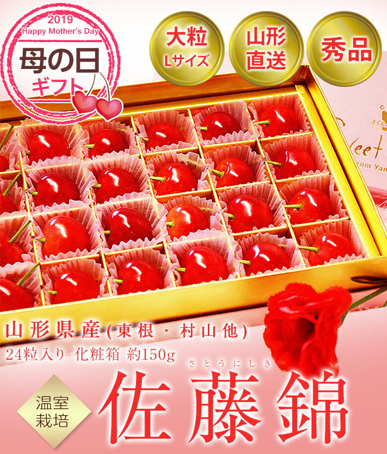 商品名 配送業者山形県産(東根・村山他)温室さくらんぼ・佐藤錦 Lサイズ 24粒入り化粧箱 産地直送 ※カーネーション(造花)・メッセージカード付き ●佐川急便配送温度帯 賞味期限・消費期限●常温デリケートな果実ですので、お手元到着後2〜3日を目安にお召し上がりください。