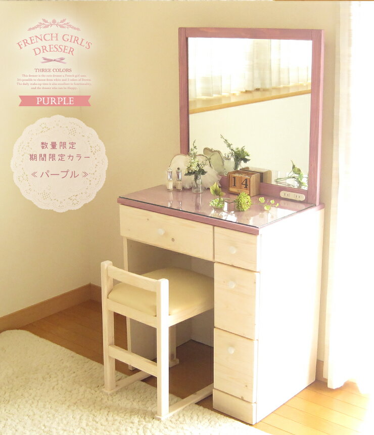 【 新生活応援 ポイント7倍 対象商品 ★ 3月26日(火)23:59まで 】開梱設置無料 ドレッサー ホワイト 1面鏡 スツール付 完成品 姫系 可愛い おしゃれ 白 ブラウン 茶 ナチュラル パープル フレンチ カントリー 北欧 パイン 無垢 1面 一面 送料無料